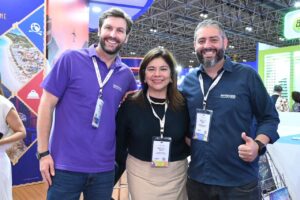 Diana Pomar ladeada por Jorge Souza e Giovana Paulineli da Orinter Tour & Travel Operadora